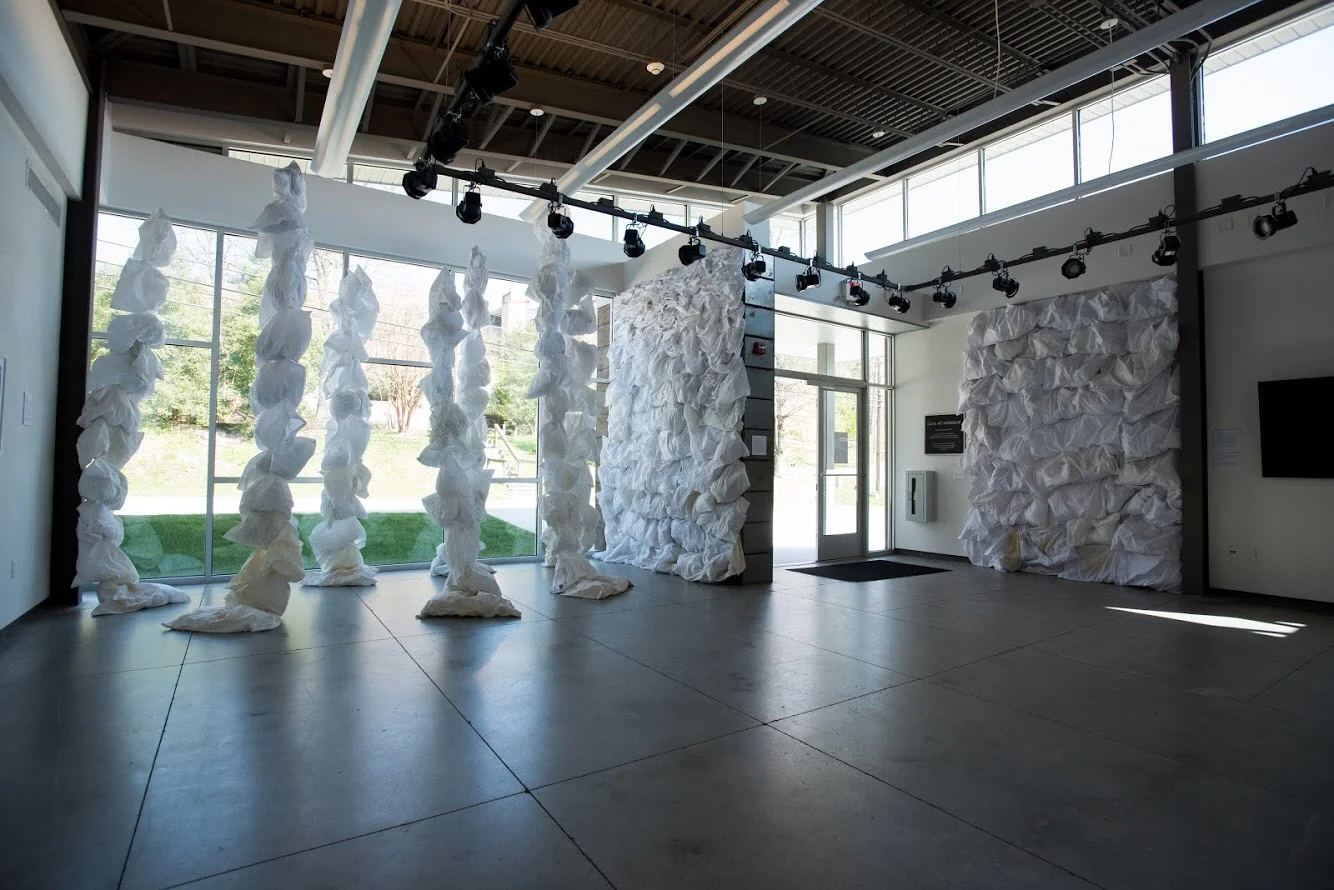Cascades of used pillowcases tumble to the floor. They hang, bodily, swaying gently as you walk by. The pillows are frozen in time, moving from clean to dirty, beautiful to repulsive, bearing traces of the people who left them behind.