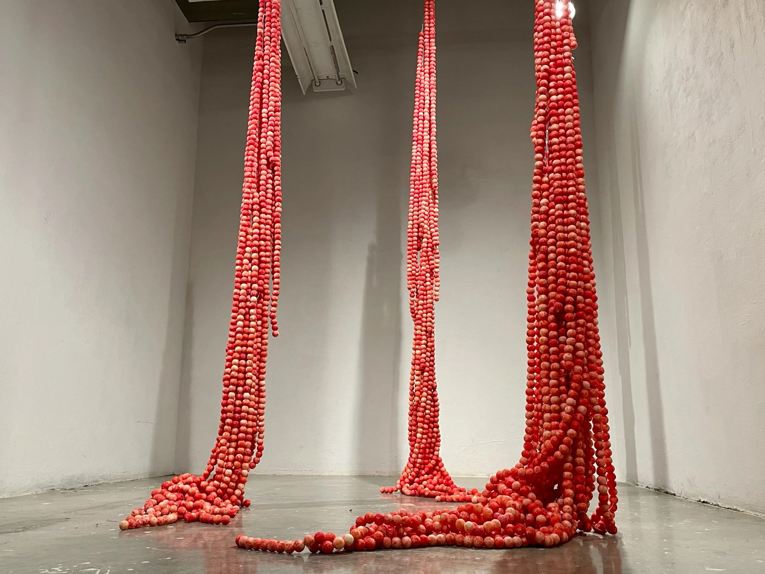 Through a process of meticulously eating and drying the membranes of hundreds of Ruby Red grapefruit segments, and harvesting 1,248 wood oat stems (both Texas native plants), this piece emerges. Each grapefruit membrane lives in a space of in-between, is it a flower petal? or something more sinister? Arranged in orderly rows, the tension between random variations in nature and human intervention is highlighted. This familiar field of flowers is visually delightful as it sways in the wake of someone passing by, but it grows increasingly strange as its rows become a graveyard, its shadows a gallows of hanging bodies, and its petals an uneasy collection of flesh.